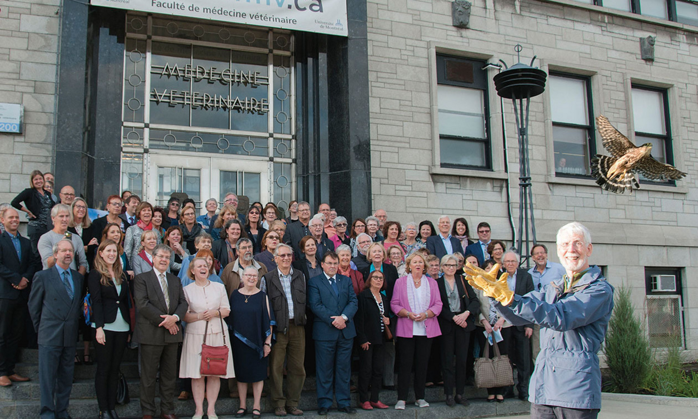Plus de 80 membres de la Société du patrimoine s’étaient donné rendez-vous, le 5 octobre dernier, sur le campus de l’Université de Montréal à Saint-Hyacinthe, pour une visite unique des installations de la Faculté de médecine vétérinaire et de son centre hospitalier universitaire. Un record de participation pour cette activité annuelle! Les invités ont pu exceptionnellement déambuler dans ces bâtiments et ont eu le privilège d’approcher un oiseau de proie au cours du cocktail qui a suivi.