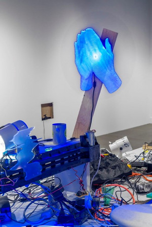 Sur une vaste table, l’artiste a accumulé et assemblé des objets hétéroclites: une sculpture de main trône au milieu de câbles enchevêtrés, un sac en carton tournoie dans les airs, des écrans scintillent, de multiples outils sont éparpillés. On voit ses tasses de café vidées dont il ne reste que de larges traces et l’on a l’impression que l’artiste nous dévoile son processus de création. Mais le dévoile-t-il réellement ou joue-t-il plutôt avec le visiteur pour lui en montrer une fausse représentation?